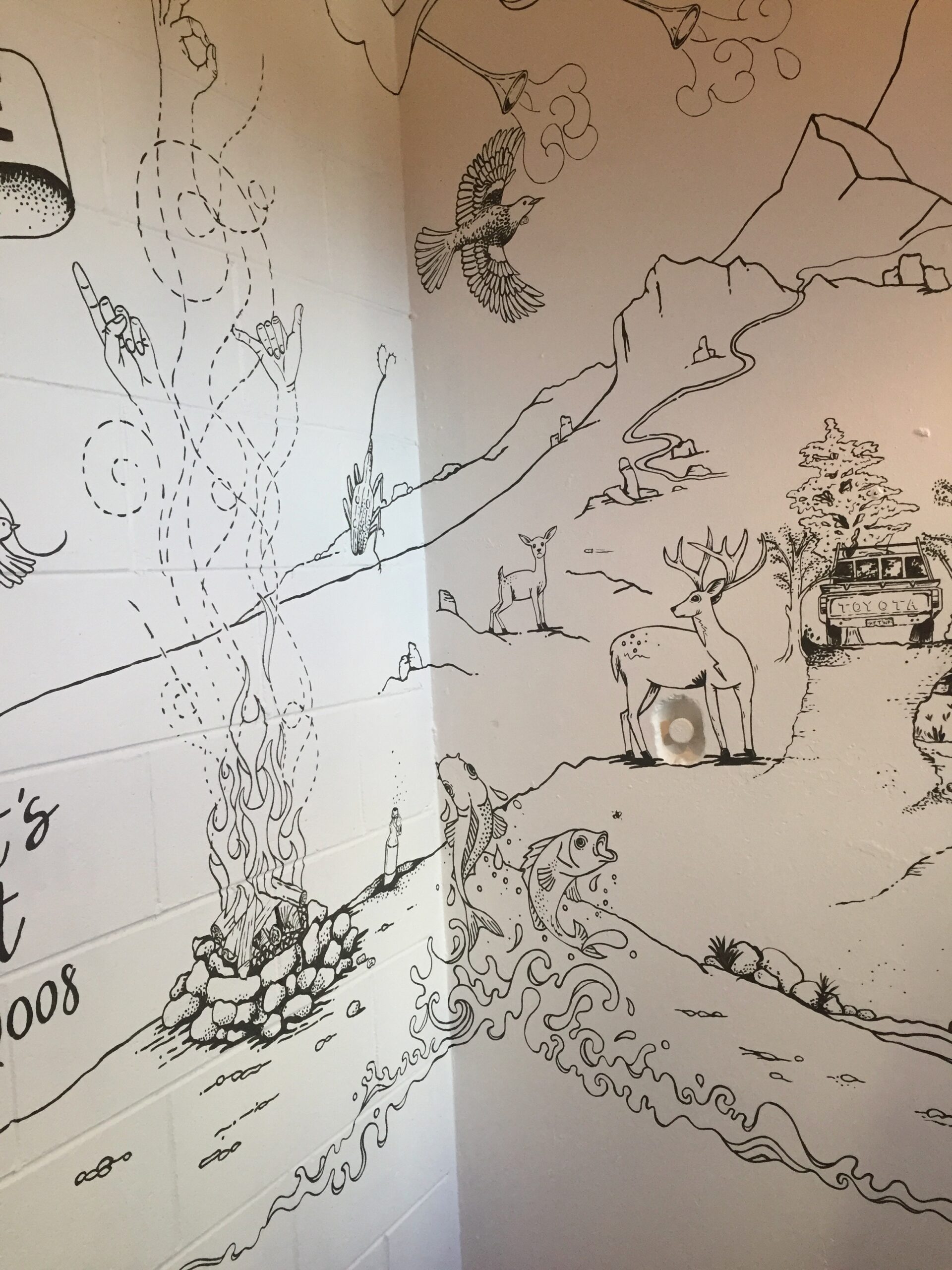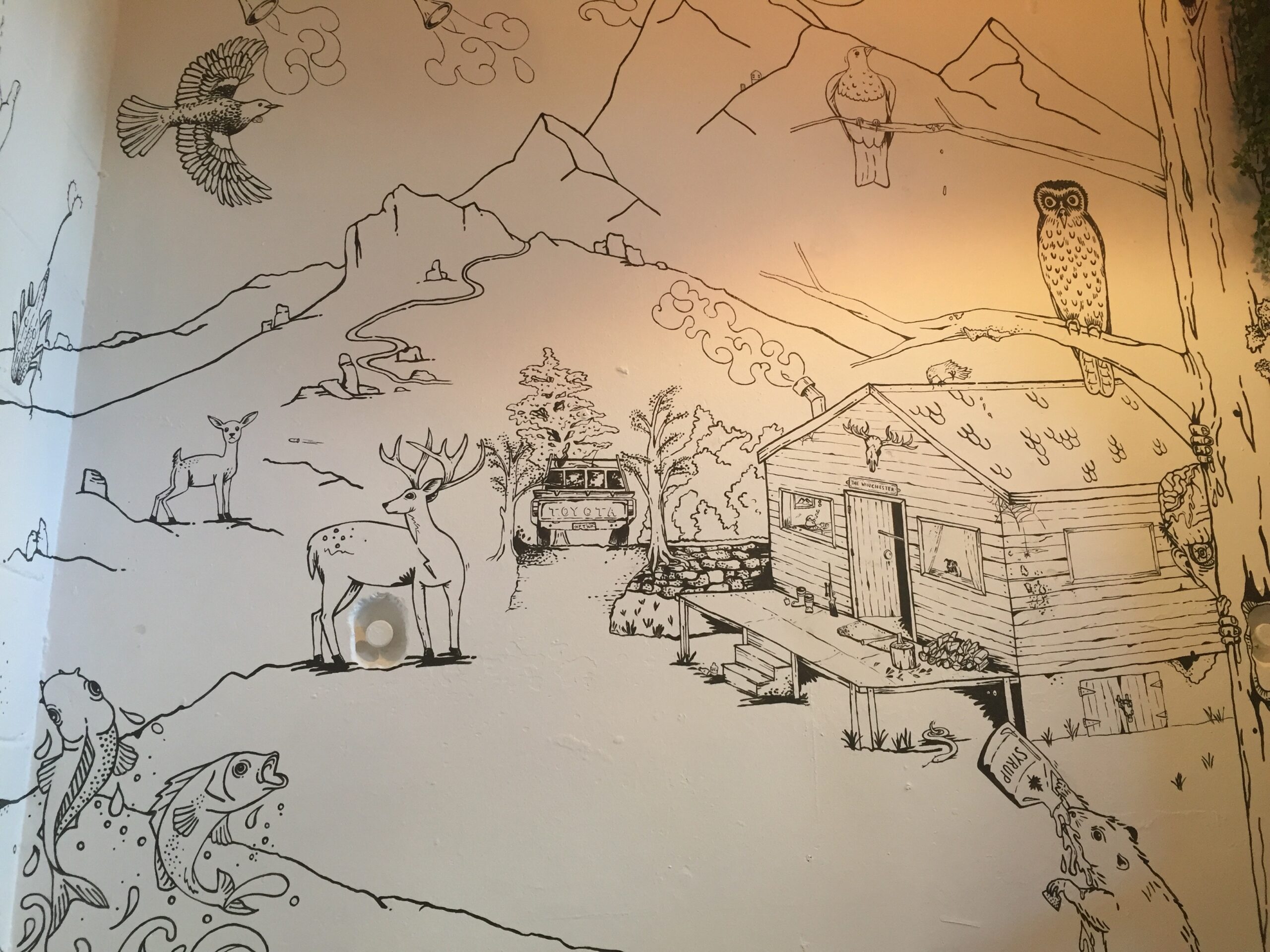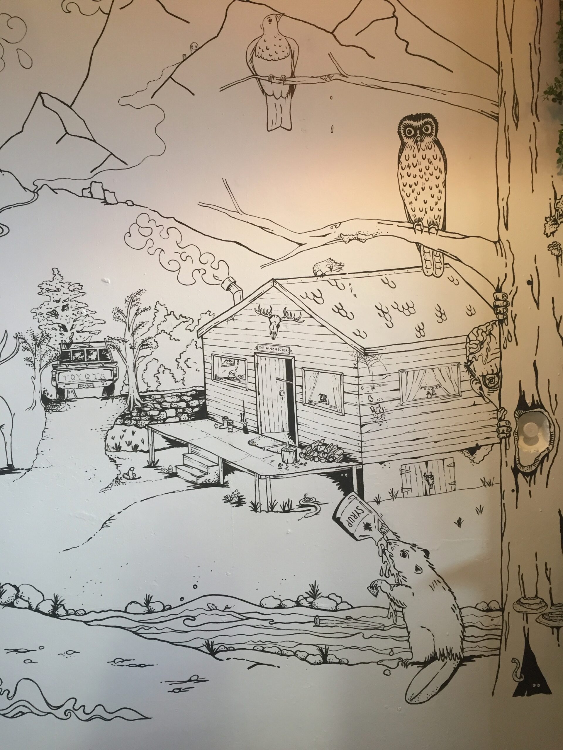 I’m really stoked with how this piece has turned out. I decided that an appropriate approach for this project was to create the entire piece with key elements designed as the first step, followed by an organic ‘fill the rest in’ approach, taking inspiration from the crew at Atlas about the subject matter and what they’d love to see up on the walls. That’s how the the Beaver chugging maple syrup and Godzilla became part of the piece.